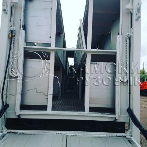 Особенности комплектации автомобиля | Кузов 2-х уровневый.Основание конструкции усиленное, выполнено из конструкционной стали, обработано антикоррозийным материалом, согласно требованиям завода изготовителя. Пол надстройки выполнен из стали дверцы делящие этажи состоят из алюминия для облегчения открывания и закрывания. Надстройка представляет собой стальной каркас, зашитый стальными панелями специального гнутого профиля. Боковые стороны кузова оборудованы вентиляционными окошками клапанами для вентиляции кузова, в количестве по выбору заказчика Верхняя часть надстройки подвижное с механическим открыванием. С внутренней стороны кузова, выполнены отсеки, разделяющее внутреннее пространства, в количестве по выбору заказчика на каждом этаже. Надстройка оборудована передними, задними и боковыми габаритными фонарями (питание от электросети автомобиля). Монтаж надстройки на шасси, согласно требованию завода изготовителя шасси. По периметру нанесена обязательная маркировка светоотражающая полоса. Установлены задние металлические крылья с резиновыми брызговиками. В комплектацию входит внутренние освещение. Надстройка оборудованна воздушными отопителями по 4,5квт по 2шт на каждый этаж с датчиками температуры воздуха в комплектацию входят пульты управления из кабины. |