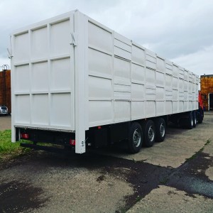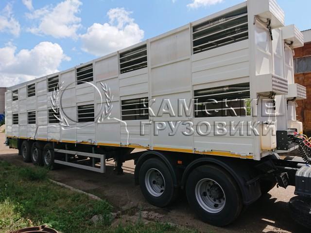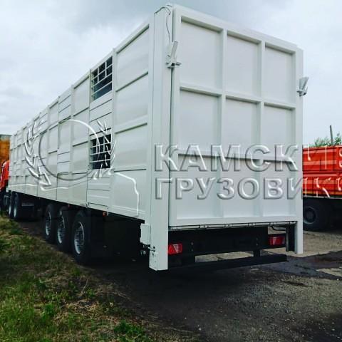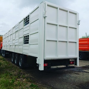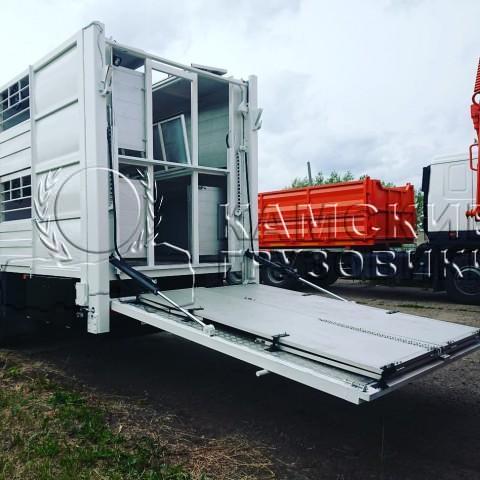 Задний гидравлический трап для погрузки / выгрузки сельскохозяйственных животных с земли и парапетов (выполнен по размеру заднего проема), фиксация на усиленных петлях к нижней части проема, опускание и подъем при помощи двух электромеханических лебедок. Настил трапа стальной. Фиксация трапа в закрытом положении с помощью специальных запорных механизмов. По бокам трапа установлены металлические ограждения, складывающиеся внутрь при закрывании кузова с фиксацией в открытом и закрытом положениях. Трап с радиопультом управления. Электроснабжение подъемного механизма исполнено в двух вариантах,Трап в темное время суток освещается.